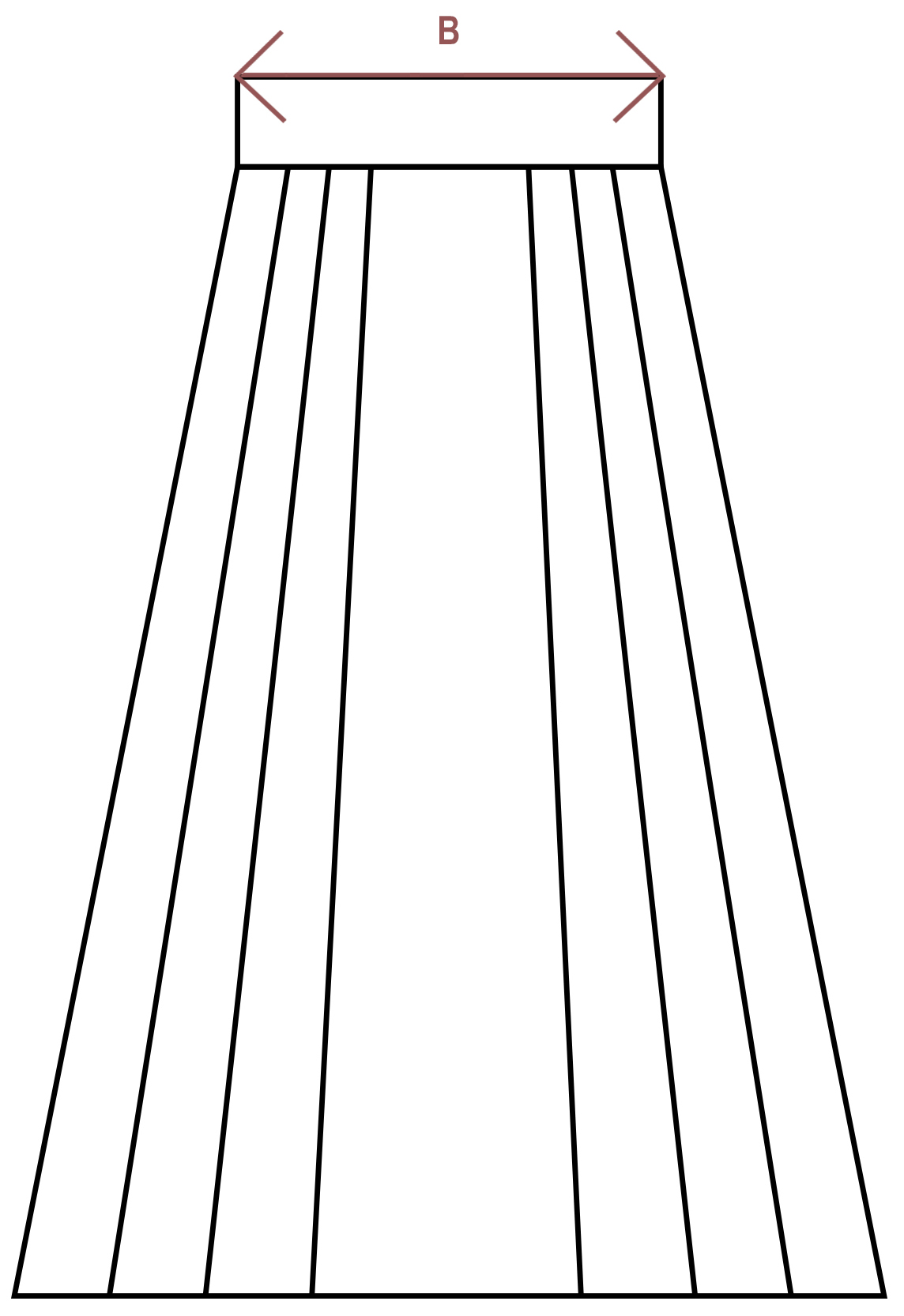 Térd alá érő, A vonalú rakott szoknya. A derékpántból induló szimmetrikus hajtások díszöltéssel rögzítettek, lépéskor nyílnak. A szoknya hátul aranyszínű húzózárral záródik.
