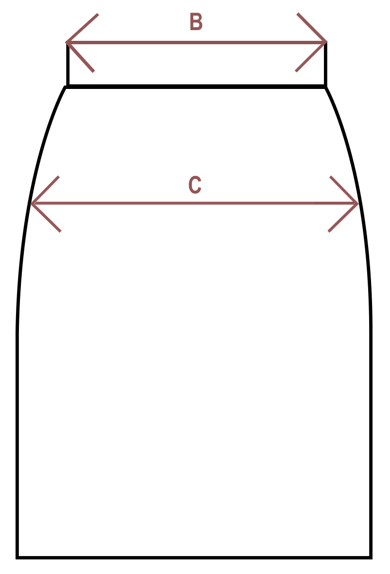 Egyenes vonalú, combközépig érő vászon szoknya, vastag, díszgumival húzott derékrésszel.