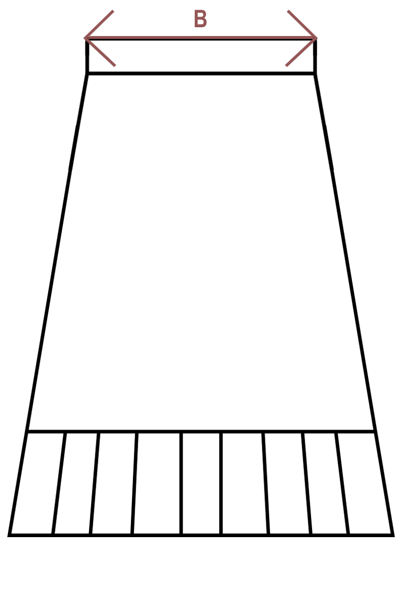 Gumis derekú, A vonalú vászon szoknya, alul hajtogatott, fodros muszlin résszel.