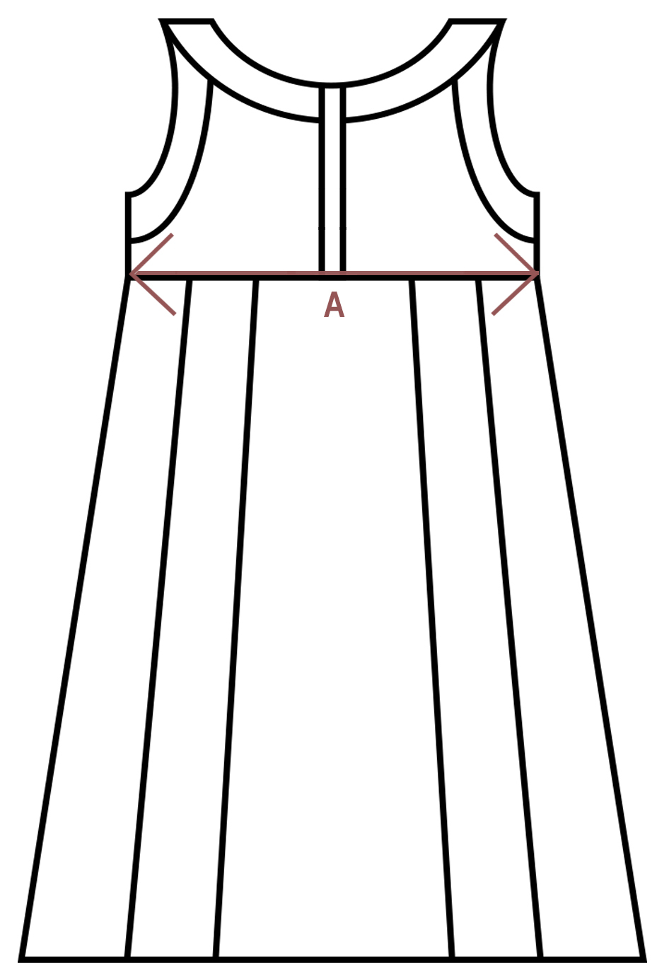 Egyberészes, A vonalú szoknyarésszel ellátott ruha, melynek hajtásai aranyszínű díszvarrással rögzítettek. A rakott szoknyarész lépéskor nyílik. A ruha szabott muszlin nyakkörrel és karöltővel ellátott. A nyakkör pántja hátul a nyakban hosszabbra hagyott, masnira köthető. A ruha felső részén, elöl aranyszínű húzózár található.